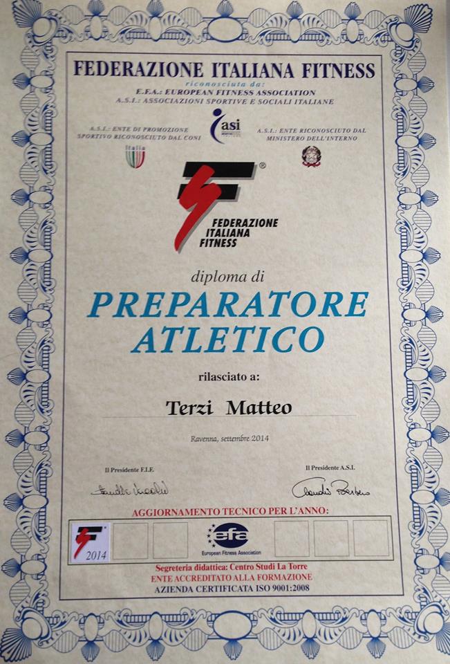 Passione che si è poi realizzata nella partecipazione, nel settembre 2014, al Corso “Preparazione Atletica” indetto dalla FIF (Federazione Italiana Fitness) e riconosciuto a livello nazionale da vari enti sportivi del Coni.